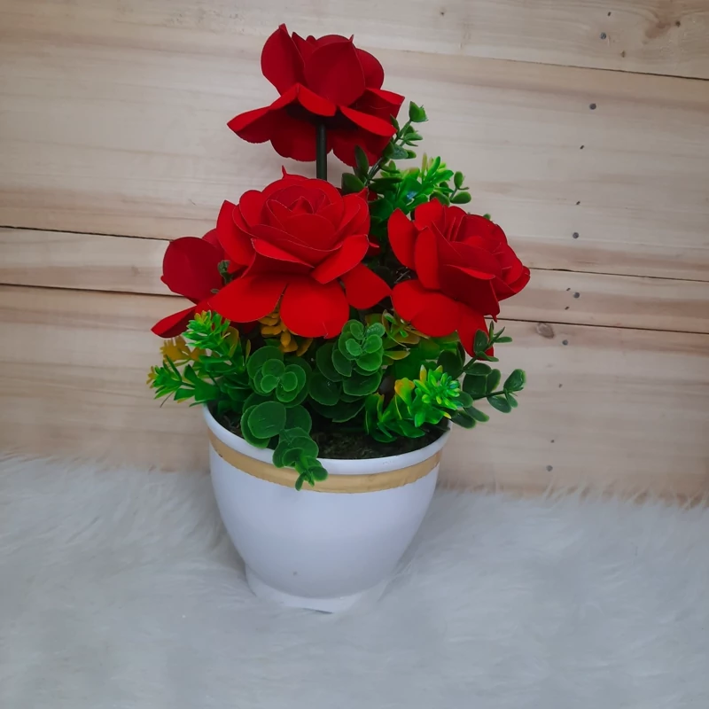 گل و گلدان رز مخملی پنج گل مصنوعی (پس کرایه)
