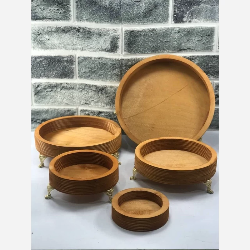 ست پذیرایی پنج تیکه چوبی گرد پایه دار محصول ساده و خاص بسیار شیک و پر فروش کاملا ضدآب و قابل شستشو ابعاد به ترتیب 22*19*15*12*9 بدون پایه و طرح دیگر این محصول داخل غرفه دکو شاین موجود است درصورت نیاز بازدید نمیابید ارسال سریع بابهترین بسته بندی