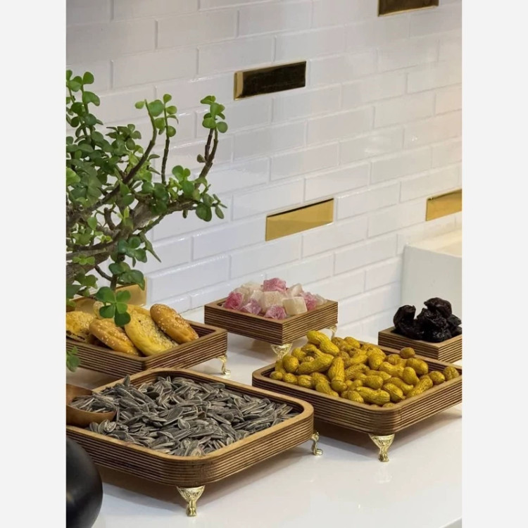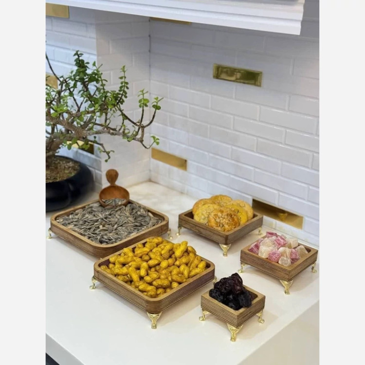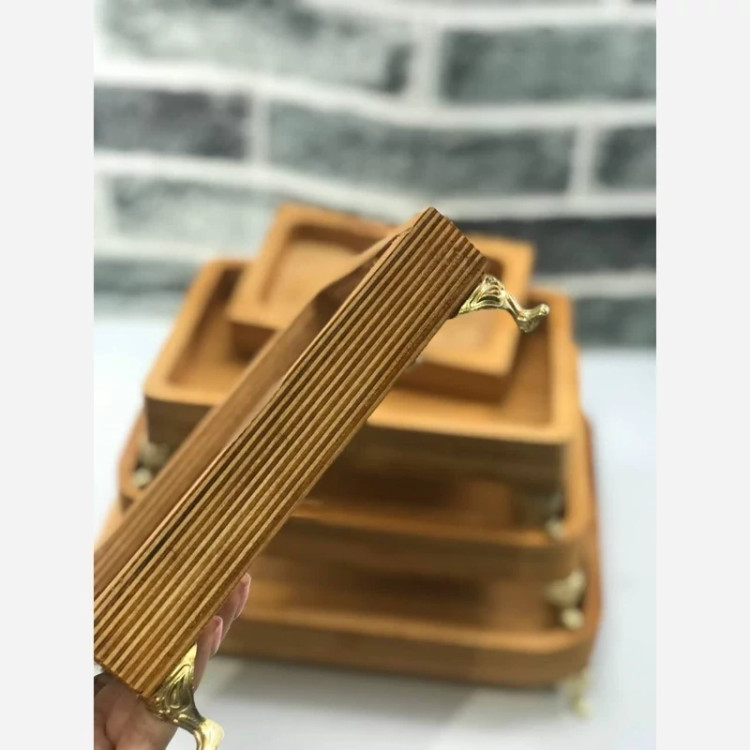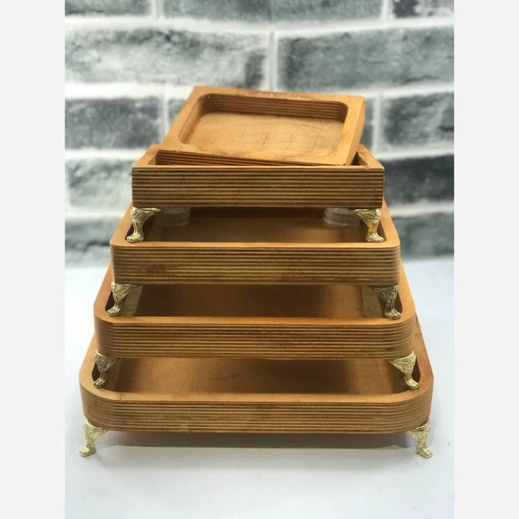 سرویس پذیرایی پنح تیکه چوبی مربع محصول ساده و خاص بسیار شکیل و پرفروش کاملا ضد آب وقابل شستشو دارای پایه فلزی کوتاه و محکم ابعاد به ترتیب 22*22 19*19 15*15 12*12 9*9 بدون پایه این محصول داخل غرفه دکواشین موجود است درصورت نیاز بازدید نمایید ارسال سریع بابهترین بسته بندی