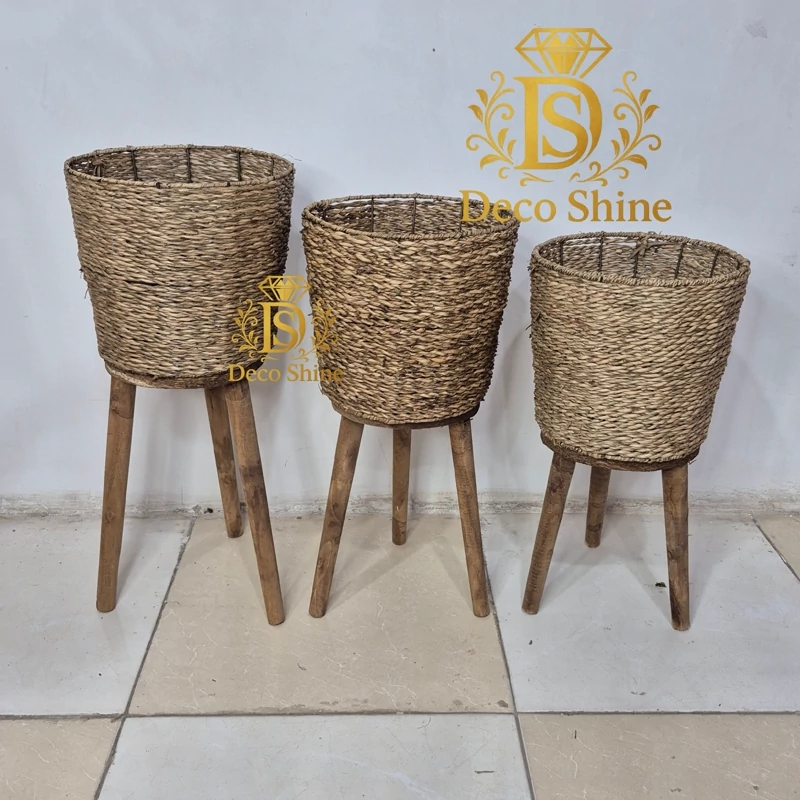 استند گل پایه گل چوبی سه تیکه گلدان حصیری دار جدیدمقاوم(پسکرایه)